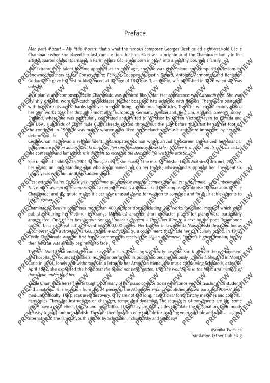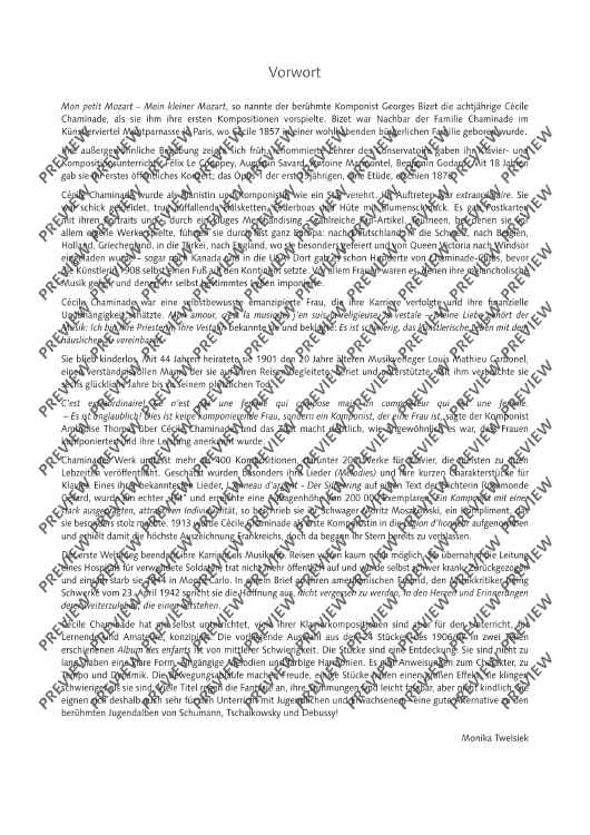 Let yourself be enchanted by the extraordinary music of Cécile Chaminade! In her ‘Album des enfants’, the celebrated composer and pianist presents an exquisite selection of 12 piano pieces that are suitable for both lessons and recitals. Each piece is a small masterpiece that delights with clear forms, catchy melodies and colourful harmonies. Cécile Chaminade, whom Georges Bizet called ‘My little Mozart’, was a pioneer of her time. Her music not only appeals to the heart, but also stimulates the imagination - ideal for teaching young people and adults. With teaching tips and suggestions regarding character, tempo and dynamics, so that playing remains fun and challenging at the same time. ‘Album des enfants’ is a wonderful alternative to the classical youth albums by Schumann, Tchaikovsky and Debussy. Delve into the melodies, the story and the unforgettable charm of Cécile Chaminade!