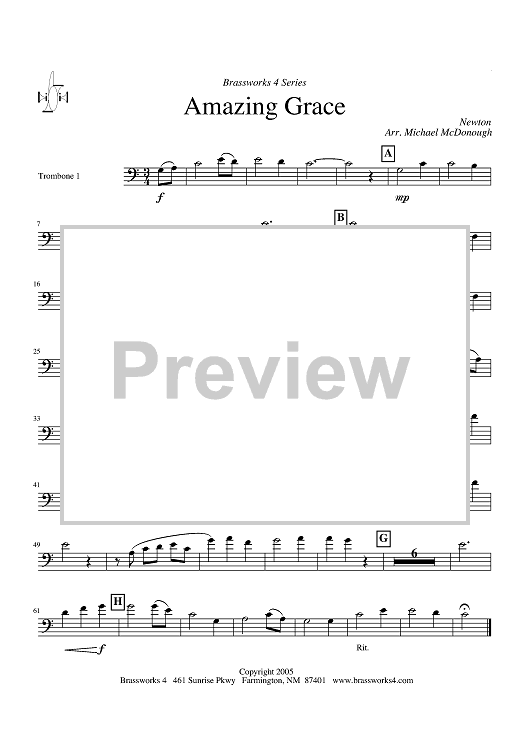 Digital Sheet Music for Amazing Grace - Trombone 1 by John Newton, Michael McDonough scored for Trombone Quartet; id:318722