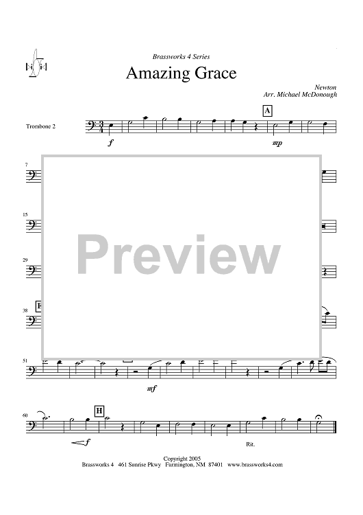 Digital Sheet Music for Amazing Grace - Trombone 2 by John Newton, Michael McDonough scored for Trombone Quartet; id:318723