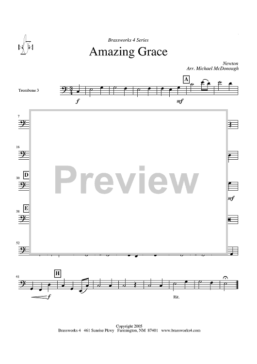 Digital Sheet Music for Amazing Grace - Trombone 3 by John Newton, Michael McDonough scored for Trombone Quartet; id:318724