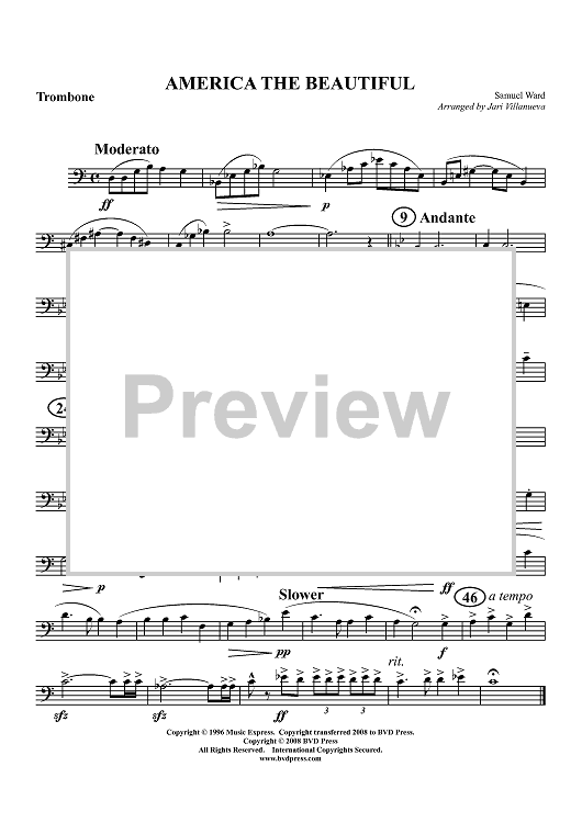 Digital Sheet Music for America the Beautiful - Trombone by Samuel A. Ward, Jari Villanueva scored for Brass Quintet; id:405082