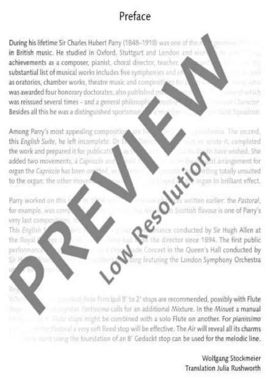 The composer, pianist, choir director and teacher Sir Charles Hubert Parry (1848-1918) was one of the most remarkable figures of the British music scene at the turn of the century. Among his most charming compositions are two suites for string orchestra. The well-known organist and composer Wolfgang Stockmeier has arranged 'English Suite' for the organ while keeping close to the original. The arrangement can be performed on the organ with brilliant effect, transferring the atmosphere of the English late Romantic era onto the organ.
