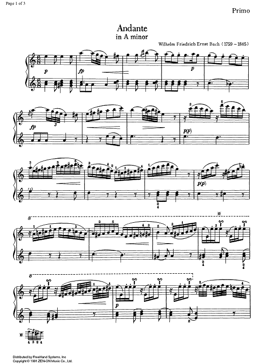Digital Sheet Music for Andante a minor - Piano 1 by Wilhelm Friedrich Ernst Bach scored for 1 Piano, 4 Hands; id:333222