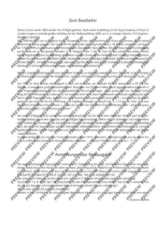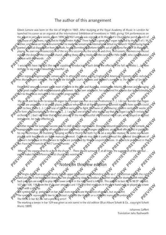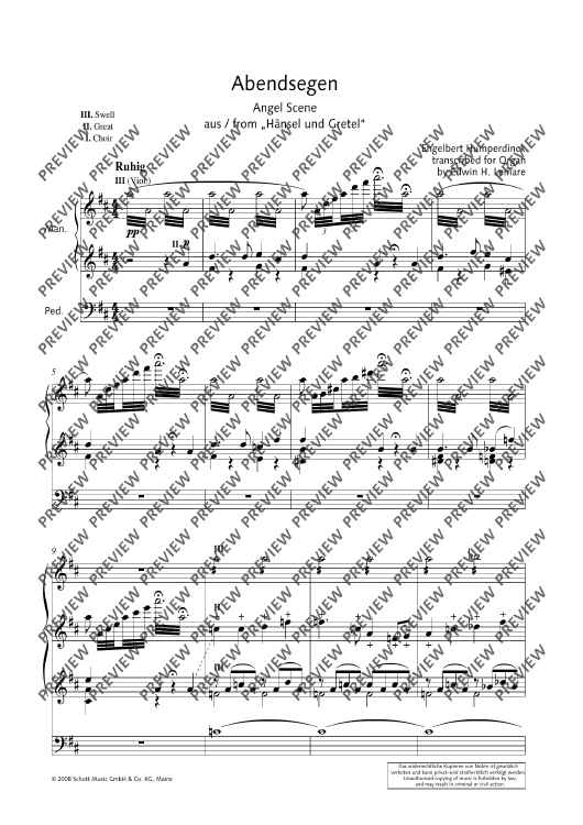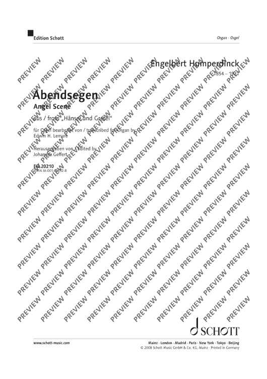 The evening prayer 'Abends will ich schlafen gehen' is certainly one of the most beautiful and moving pieces in Humperdinck's fairy-tale opera 'Hansel and Gretel'. The British organist Edwin H. Lemare (1865-1934) who was famous for his improvisations and transcriptions wrote an arrangement of this work under the title of 'Angel Scene'. Following closely the original score and skilfully selecting stops, he created a version that still today does not fail to have its desired effect on the audience.
