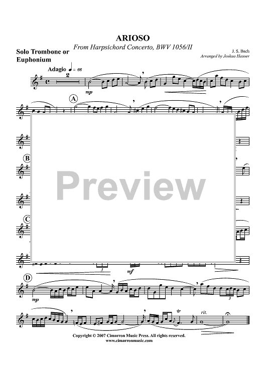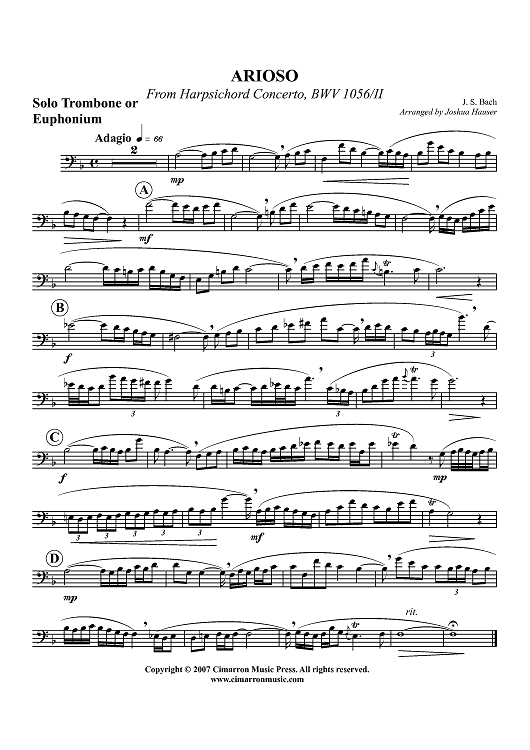 Digital Sheet Music for Arioso from Harpsichord Concerto, BWV 1056/II - Solo Trombone or Euphonium BC/TC by Johann Sebastian Bach, Joshua Hauser scored for Trombone Choir; id:361371