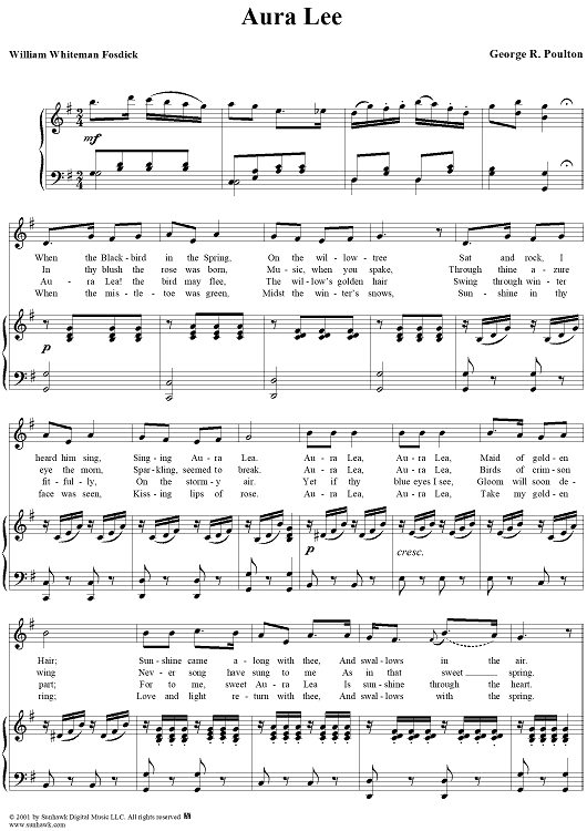 Digital Sheet Music for Aura Lee by George R. Poulton, W. W. Fosdick scored for Piano/Vocal; id:276903