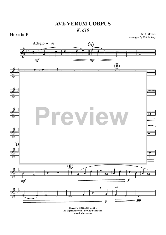 Digital Sheet Music for Ave Verum Corpus - K. 618 - Horn in F by Wolfgang Amadeus Mozart, Bill Yeckley scored for Brass Quintet; id:428126