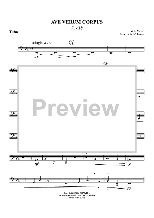 Digital Sheet Music for Ave Verum Corpus - K. 618 - Tuba by Wolfgang Amadeus Mozart, Bill Yeckley scored for Brass Quintet; id:428128