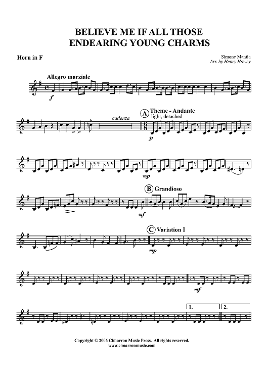 "Believe Me If All Those Endearing Young Charms - Horn in F" Sheet Music by Simone Mantia