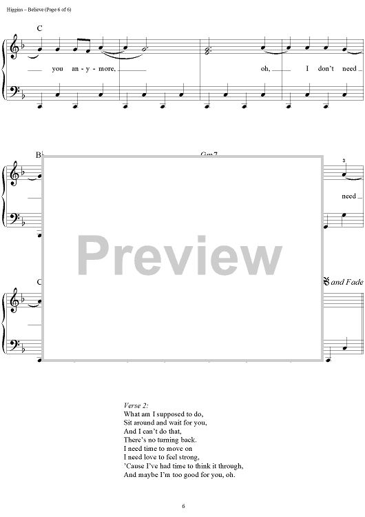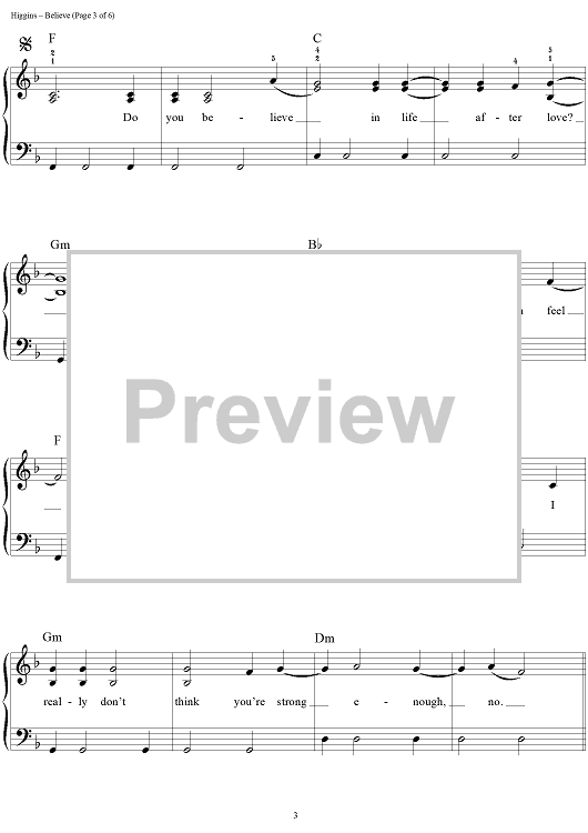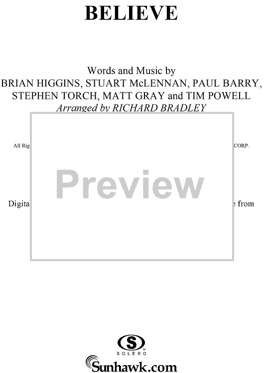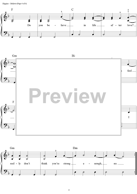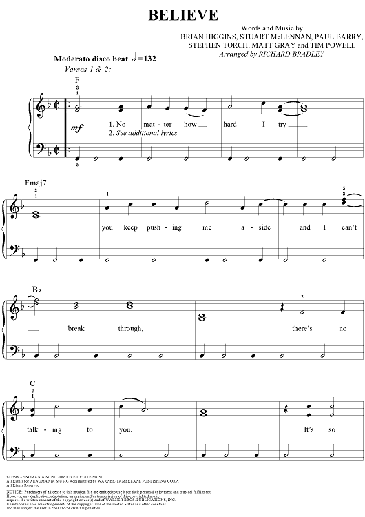 Digital Sheet Music for Believe by Cher, Richard Bradley, Brian Higgins, Stuart McLennan, Timothy Gatlin, Stephen Torch, Matt Gray, Tim Powell scored for Easy Piano/Vocal; id:285096