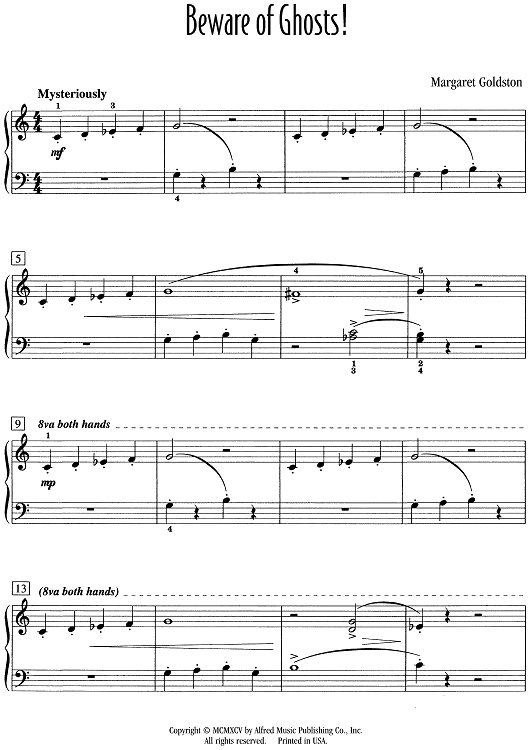 The sound of tip-toeing staccatos in a spooky C-minor setting are featured in this haunting Halloween piece in Middle-C position, along with accidentals, hand-over-hand technique, and an exploration of the lower and higher parts of the keyboard.