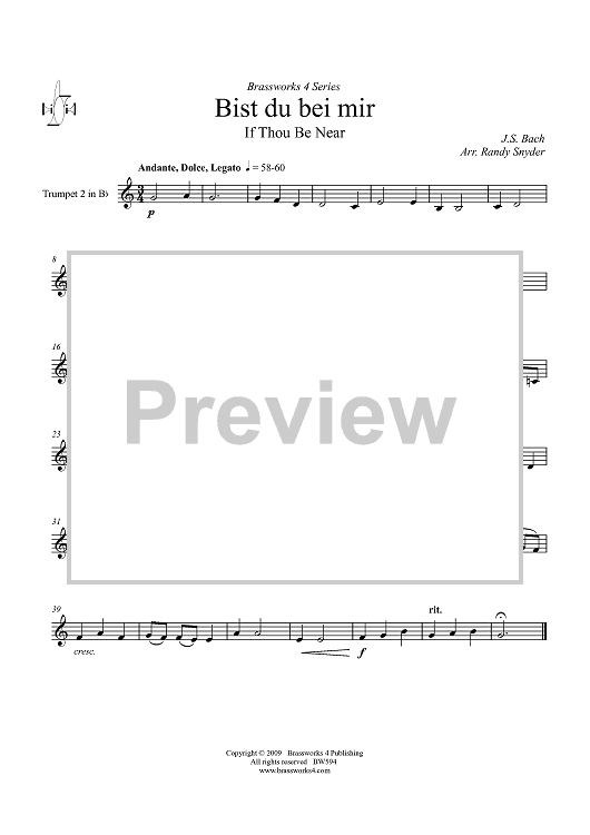 Digital Sheet Music for Bist Du Bei Mir - Trumpet in B-flat by Johann Sebastian Bach, Randy Snyder scored for Brass Quartet; id:410580