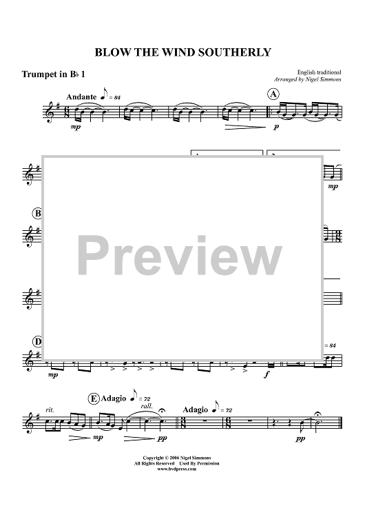 Digital Sheet Music for Blow the Wind Southerly - Trumpet 1 in B-flat by Traditional English Melody, Nigel Simmons scored for Brass Quintet; id:364239