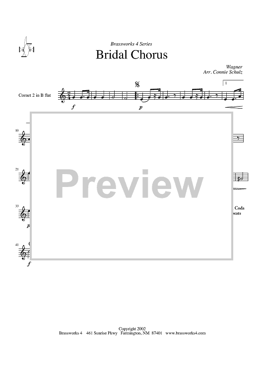 Digital Sheet Music for Bridal Chorus - Cornet 2/Trumpet 2 by Richard Wagner, Connie Schulz scored for Brass Quartet; id:316640