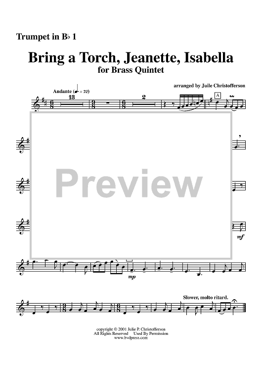 Digital Sheet Music for Bring a Torch, Jeanette, Isabella - Trumpet 1 by Julie Christofferson scored for Brass Quintet; id:314053