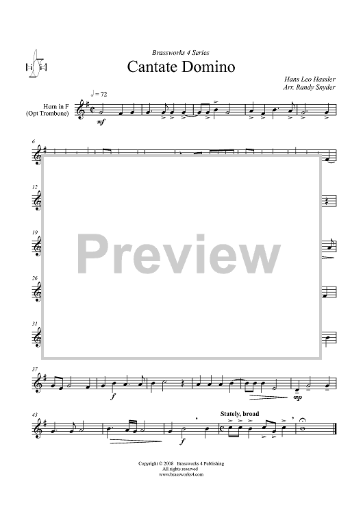 Digital Sheet Music for Cantate Domino - Horn in F (opt. Trombone 1) by Hans Leo Hassler, Randy Snyder scored for Brass Quartet; id:410591