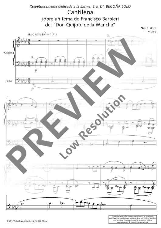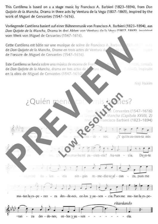 This Cantilena is based on a a stage music by Francisco A. Barbieri (1823–1894), from Don Quijote de la Mancha, Drama in three acts by Ventura de la Vega (1807–1865), inspired by the work of Miguel de Cervantes (1547–1616).