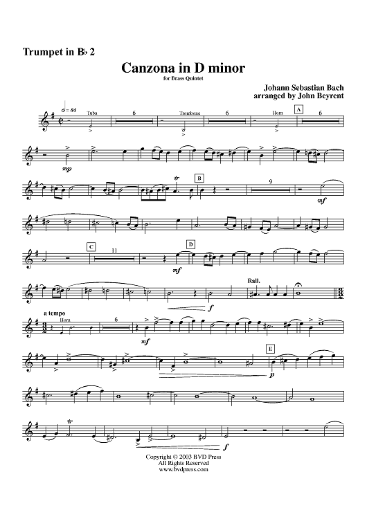 Digital Sheet Music for Canzona in D Minor - Trumpet 2 by John Beyrent, Johann Sebastian Bach scored for Brass Quintet; id:312298