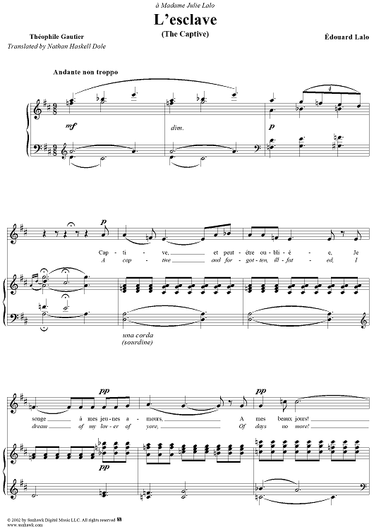 Digital Sheet Music for Captive, The (L'Esclave) by Théophile Gautier, Edouard Victoire Antoine Lalo scored for Voice/Piano; id:269160