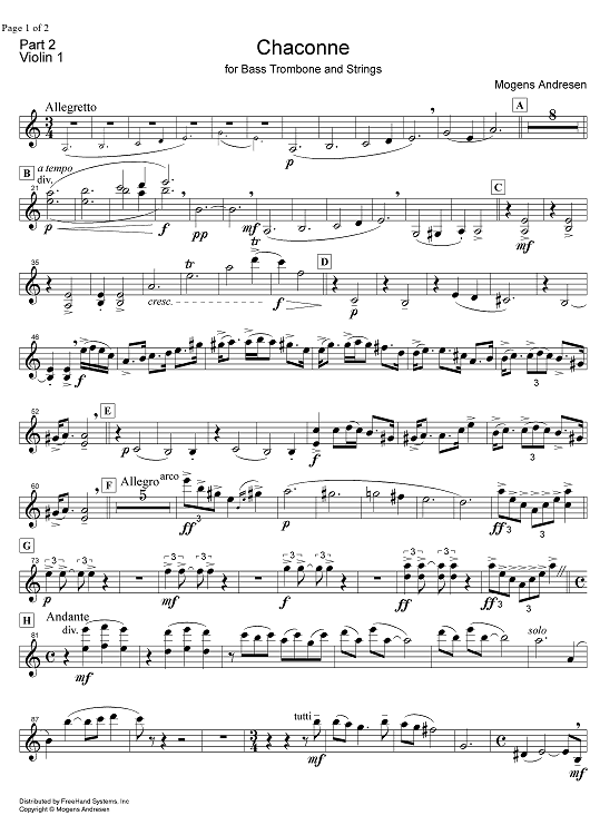 Digital Sheet Music for Chaconne - Violin 1 by Mogens Andresen scored for Bass Trombone/Strings; id:328207