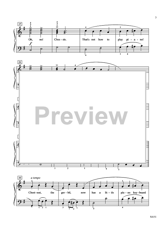 This early intermediate level piece portrays a delightful "true" story about a gerbil named Chestnut, who was attracted by beautiful piano music and found her way inside the piano! Along with the playful, entertaining lyrics are an assortment of articulations, a catchy melody, and a wide range of dynamics that students will love to play again and again.