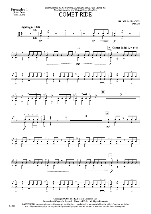 Digital Sheet Music for Comet Ride - Percussion 1 by Brian Balmages scored for Concert Band; id:443300