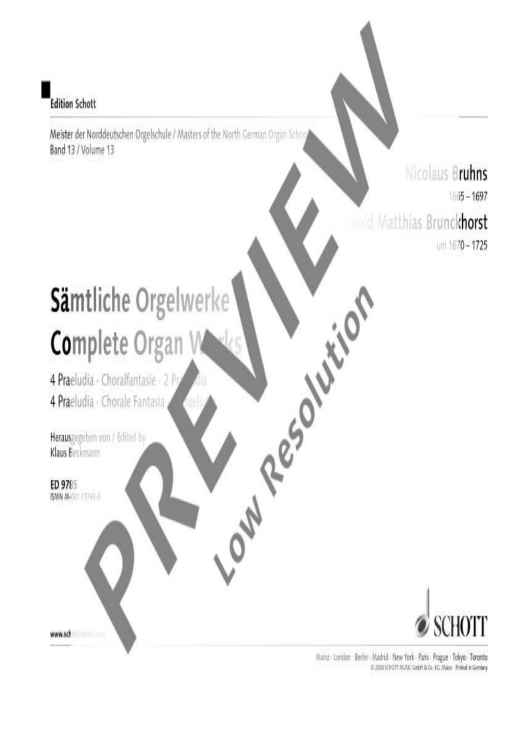 Volume 13 of the series 'Meister der Norddeutschen Orgelschule' contains all organ works by Nicolaus Bruhns. Bruhns studied with Dietrich Buxtehude and, from 1689, was cathedral organist in Husum.