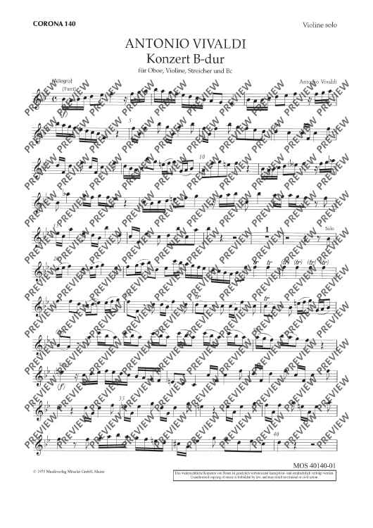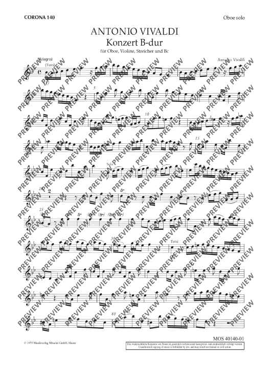 Digital Sheet Music for Concerto B-flat major - Set of Parts by Antonio Vivaldi, Felix Schroeder scored for Oboe, Violin, String Orchestra And Basso Continuo; id:506881
