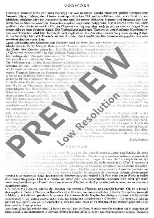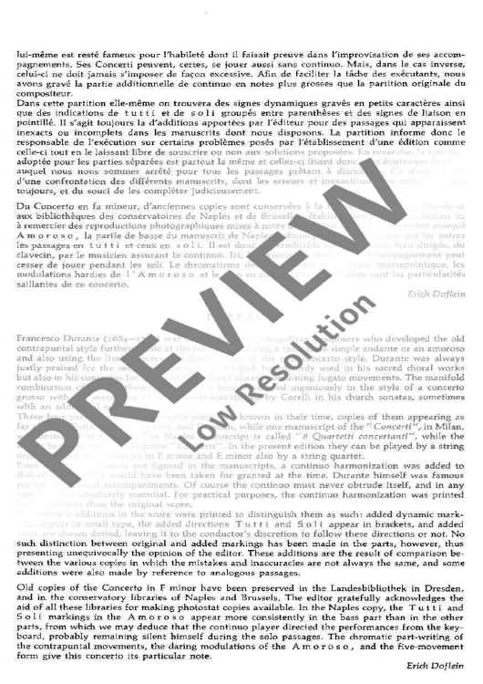 Die vierstimmigen Concerti des bedeutenden neapolitanischen Meisters Durante können von Streichorchestern mit oder ohne Generalbass aufgeführt werden, die Concerti f-Moll und e-Moll auch mit Streichquartett.