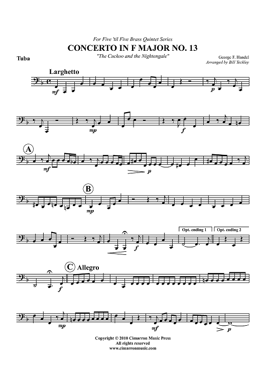 Digital Sheet Music for Concerto in F Major No. 13 - "The Cuckoo and the Nightengale" - Tuba by George Frideric Handel, Bill Yeckley scored for Brass Quintet; id:427162