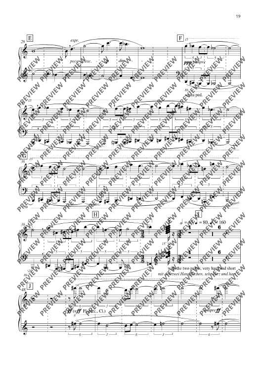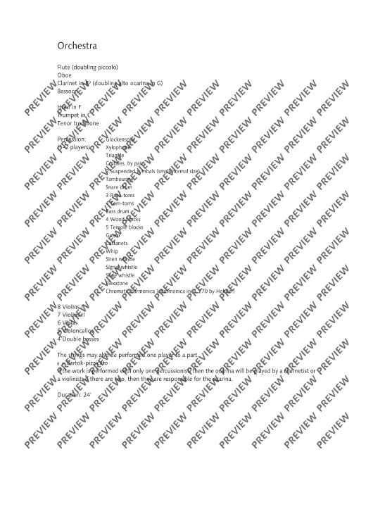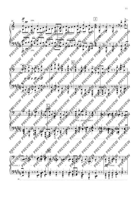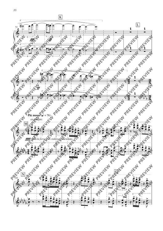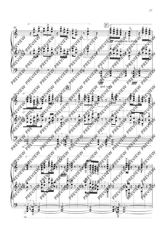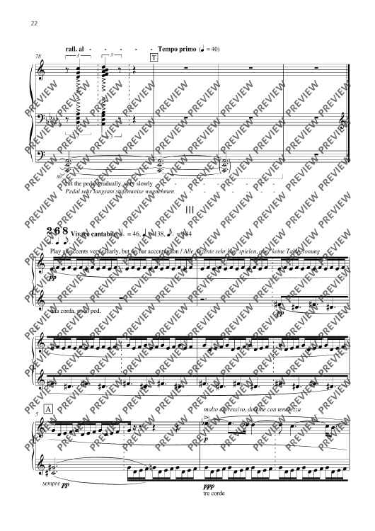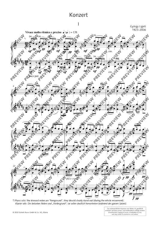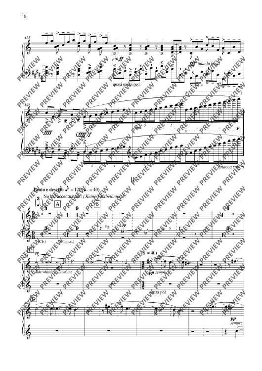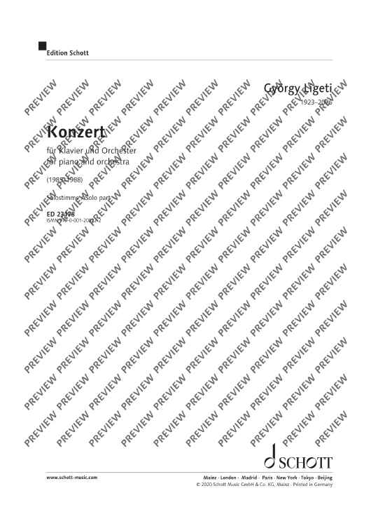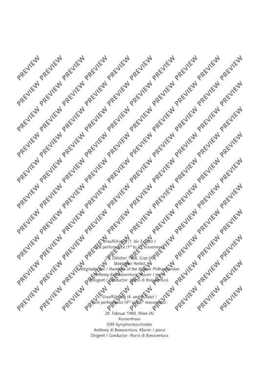 I composed the Piano Concerto in two stages: the first three movements during the years 1985-86, the next two in 1987, the final autograph of the last movement was ready by January, 1988. The concerto is dedicated to the American conductor Mario di Bonaventura. The markings of the movements are the following: 1. Vivace molto ritmico e preciso 2. Lento e deserto 3. Vivace cantabile 4. Allegro risoluto 5. Presto luminoso. The first performance of the three-movement Concerto was on October 23rd, 1986 in Graz. Mario di Bonaventura conducted while his brother, Anthony di Bonaventura, was the soloist. Two days later the performance was repeated in the Vienna Konzerthaus. After hearing the work twice, I came to the conclusion that the third movement is not an adequate finale; my feeling of form demanded continuation, a supplement. That led to the composing of the next two movements. The premiere of the whole cycle took place on February 29th, 1988, in the Vienna Konzerthaus with the same conductor and the same pianist. The orchestra consisted of the following: flute, oboe, clarinet, bassoon, horn, trumpet, tenor trombone, percussion and strings. The flautist also plays the piccoIo, the clarinetist, the alto ocarina. The percussion is made up of diverse instruments, which one musician-virtuoso can play. It is more practical, however, if two or three musicians share the instruments. Besides traditional instruments the percussion part calls also for two simple wind instruments: the swanee whistle and the harmonica. The string instrument parts (two violins, viola, cello and doubles bass) can be performed soloistic since they do not contain divisi. For balance, however, the ensemble playing is recommended, for example 6-8 first violins, 6-8 second, 4-6 violas, 4-6 cellos, 3-4 double basses. In the Piano Concerto I realized new concepts of harmony and rhythm. The first movement is entirely written in bimetry: simultaneously 12/8 and 4/4 (8/8). This relates to the known "triplet
