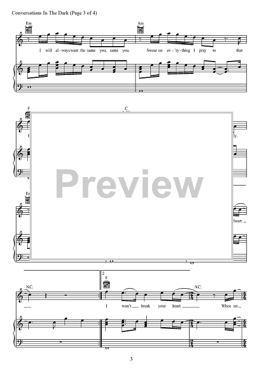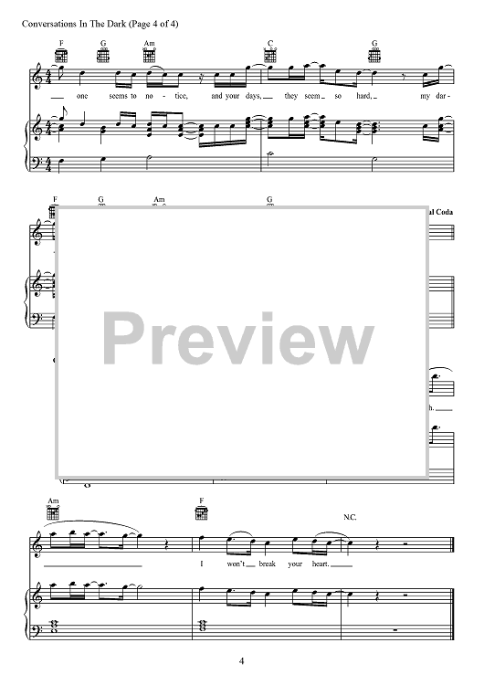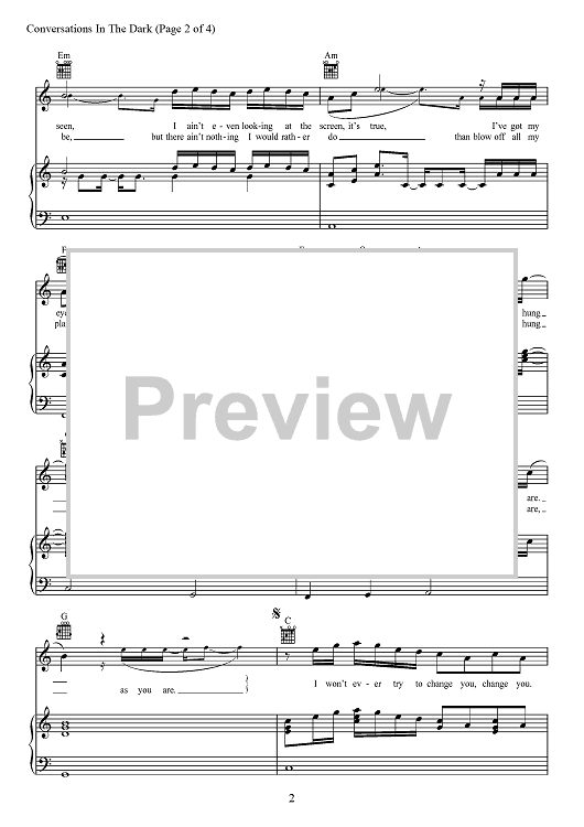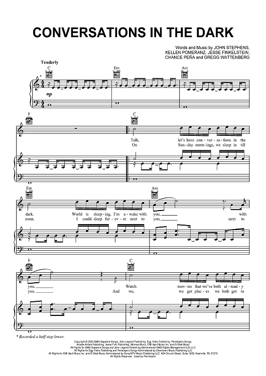 Digital Sheet Music for Conversations In The Dark by John Legend, Gregg Wattenberg, Kellen Pomeranz, Jesse Finkelstein, Chance Peña scored for Piano/Vocal/Chords; id:467964