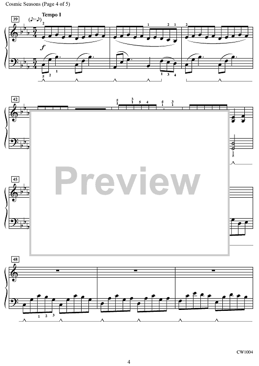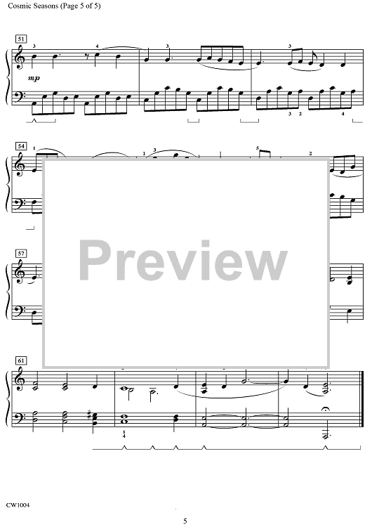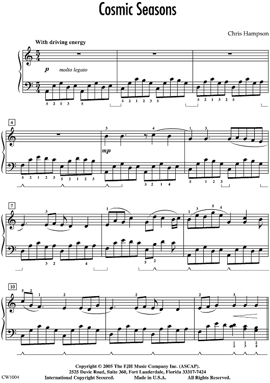 This energetic piece opens with rumbling eighth notes and New Age harmonies, which ask the listener to be ready for adventure. Cosmic Seasons then runs through periodic meter changes, accelerando passages, and dynamic broad strokes that are both beautiful and (at times) bewildering. Let your imagination fly!