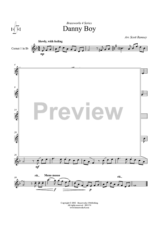 Digital Sheet Music for Danny Boy - Cornet 1 in Bb by Traditional Irish Melody, Scott Ramsey scored for Brass Quartet; id:428567