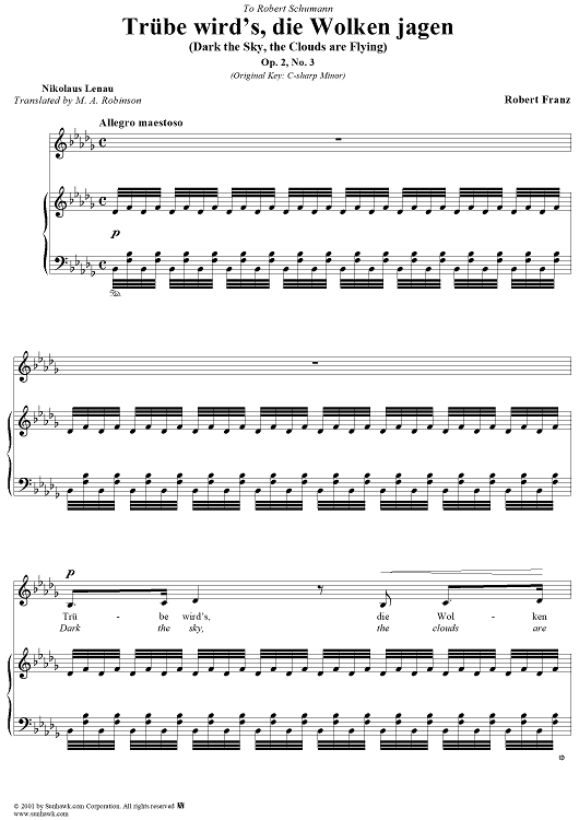 Digital Sheet Music for Dark the Sky, the Clouds are Flying (Trübe wird's, die Wolken jagen) by Robert Franz, Nikolaus Leneau scored for Voice/Piano; id:269312