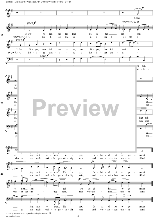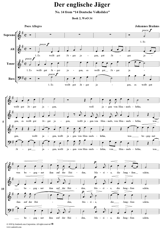 Digital Sheet Music for Der englische Jäger - No. 14 from "14 Deutsche Volkslieder" Book 2, WoO 34 by , Johannes Brahms scored for Four-part Mixed Chorus; id:274452
