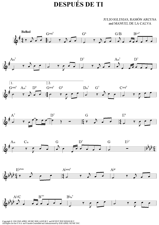 Digital Sheet Music for Después De Ti by Julio Iglesias, Ramon Arcusa, Manuel De La Calva scored for Lead Sheet; id:445611
