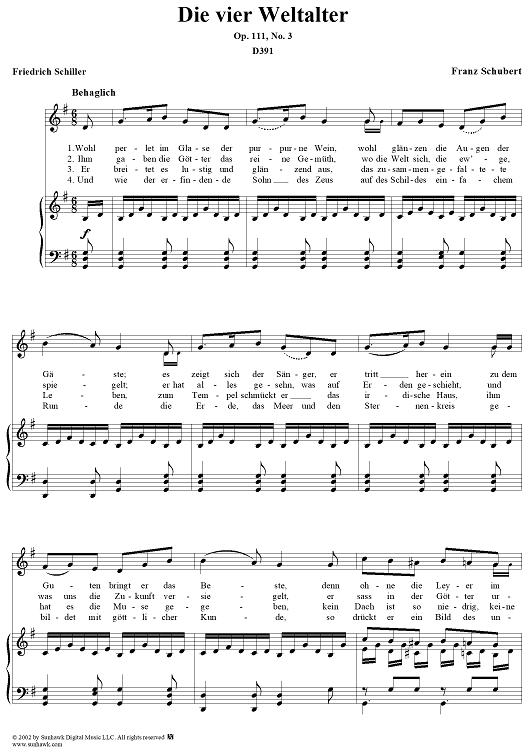 Digital Sheet Music for Die vier Weltalter, Op. 111, No. 3, D391 by Franz Schubert scored for Voice/Piano; id:256664