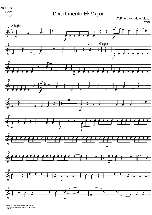 "Divertimento Eb Major KV289 - Horn in E-flat 2" Sheet Music by Wolfgang Amadeus Mozart