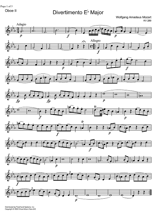 "Divertimento Eb Major KV289 - Oboe 2" Sheet Music by Wolfgang Amadeus Mozart