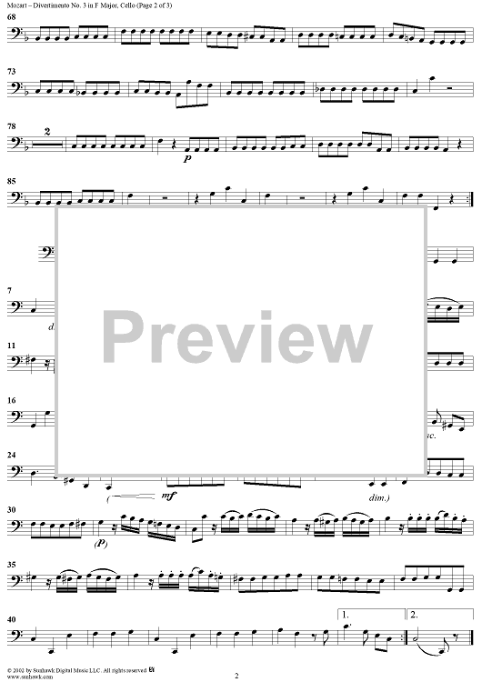 "Divertimento No. 3 in F Major, K138 - Cello" Sheet Music by Wolfgang Amadeus Mozart