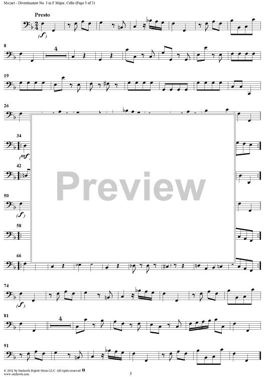 Digital Sheet Music for Divertimento No. 3 in F Major, K138 - Cello by Wolfgang Amadeus Mozart scored for String Quartet; id:253055