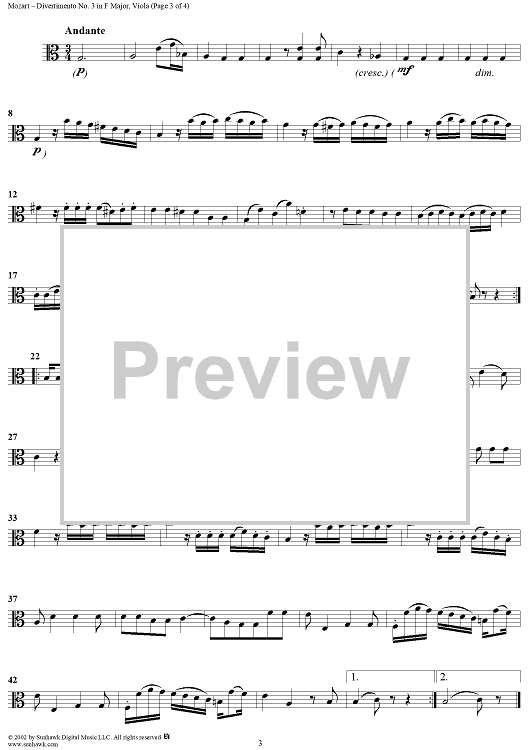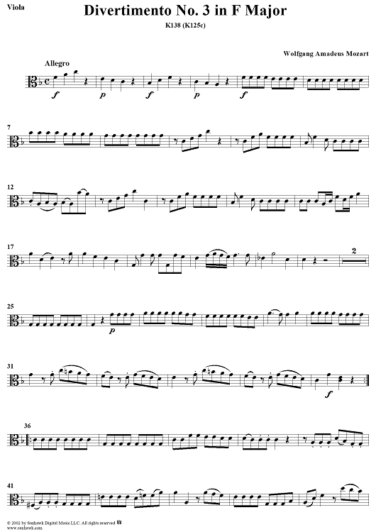 "Divertimento No. 3 in F Major, K138 - Viola" Sheet Music by Wolfgang Amadeus Mozart