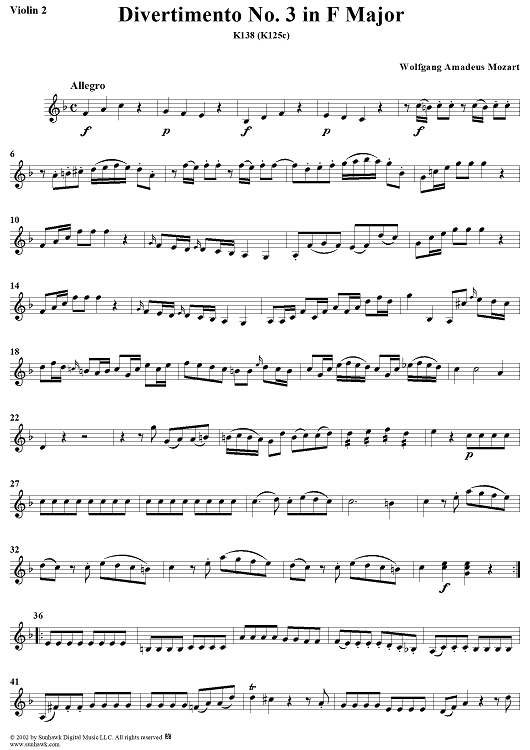 "Divertimento No. 3 in F Major, K138 - Violin 2" Sheet Music by Wolfgang Amadeus Mozart