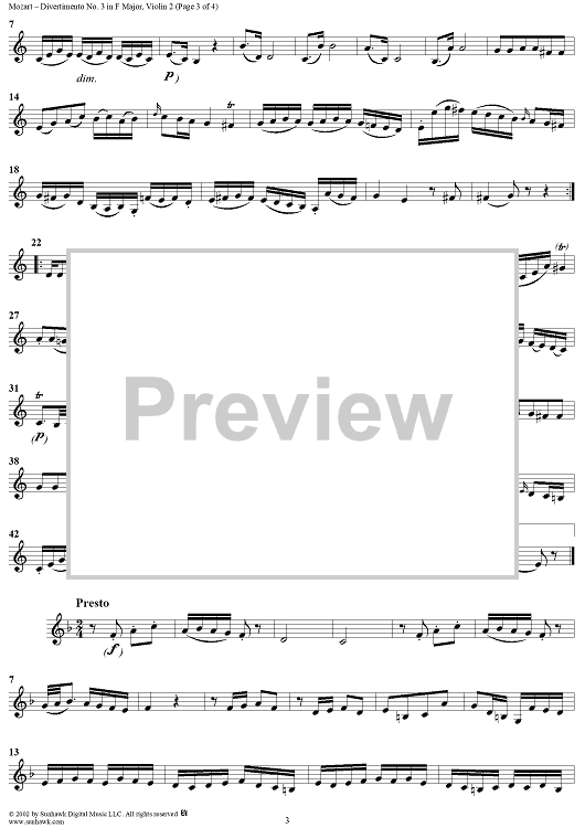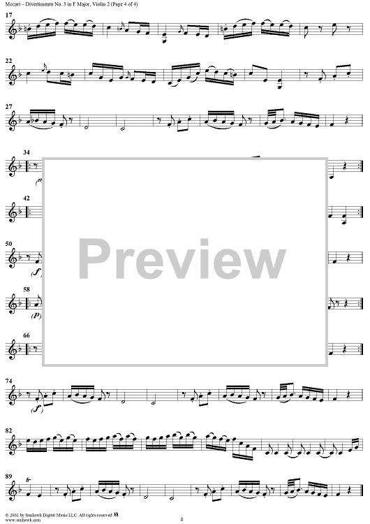 Digital Sheet Music for Divertimento No. 3 in F Major, K138 - Violin 2 by Wolfgang Amadeus Mozart scored for String Quartet; id:253060