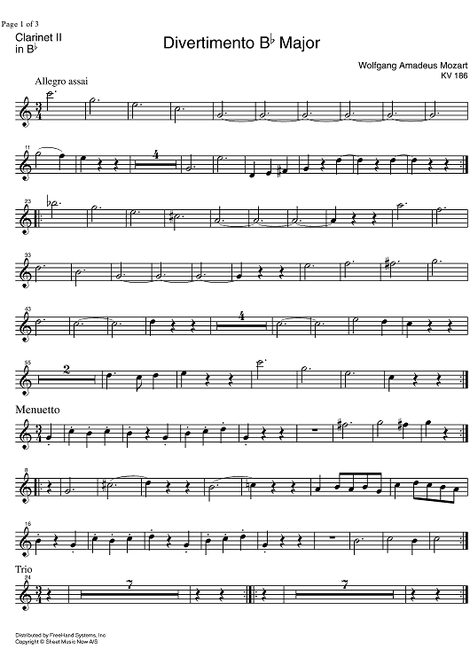 Digital Sheet Music for Divertimento No. 4 Bb Major KV186 - Clarinet 2 by Wolfgang Amadeus Mozart scored for Wind Ensemble; id:331683