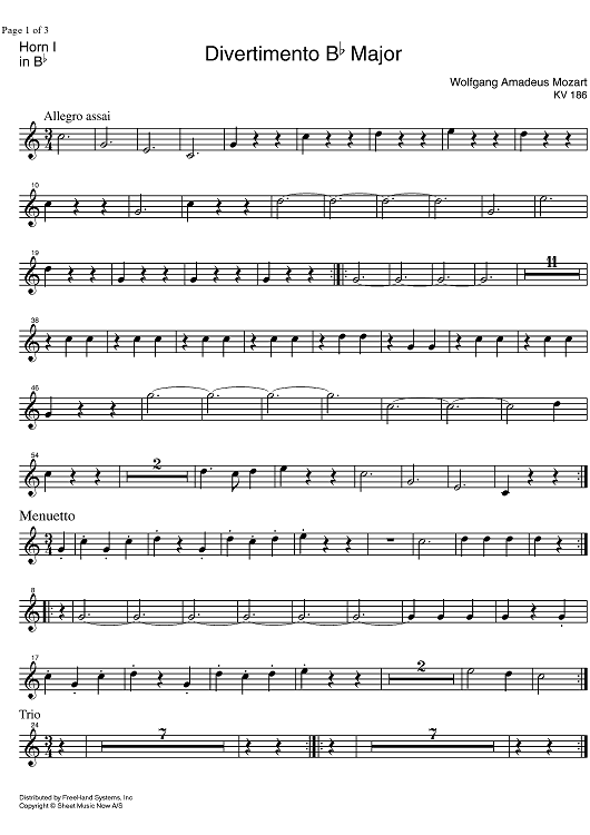 Digital Sheet Music for Divertimento No. 4 Bb Major KV186 - Horn 1 by Wolfgang Amadeus Mozart scored for Wind Ensemble; id:331685