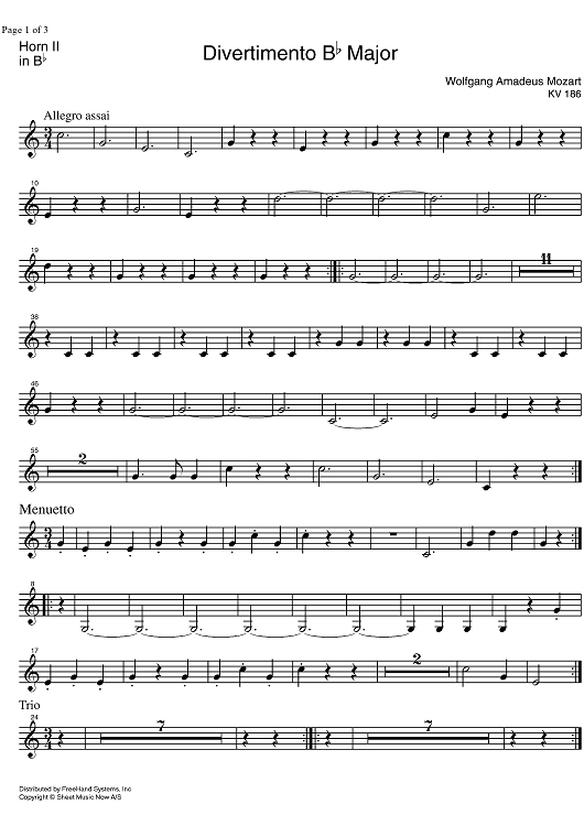 Digital Sheet Music for Divertimento No. 4 Bb Major KV186 - Horn 2 by Wolfgang Amadeus Mozart scored for Wind Ensemble; id:331686
