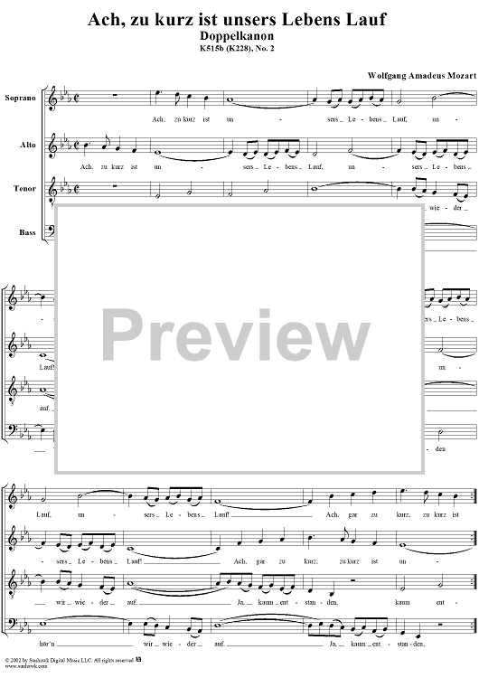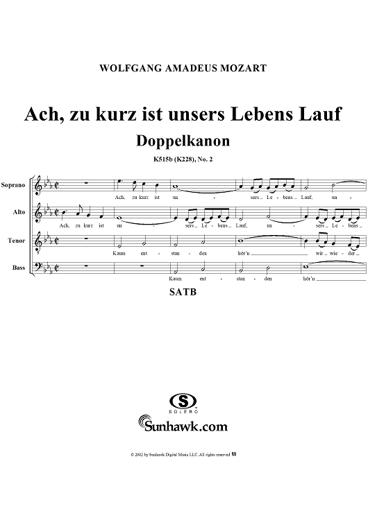 Digital Sheet Music for Doppelkanon: Ach! zu kurz ist unsers Lebens Lauf (K515b (K228), No. 2) by Wolfgang Amadeus Mozart scored for Four-part Mixed Chorus; id:266116