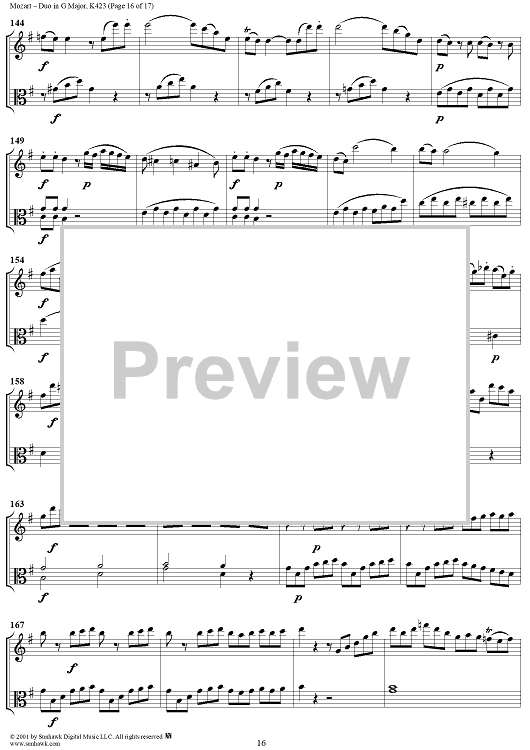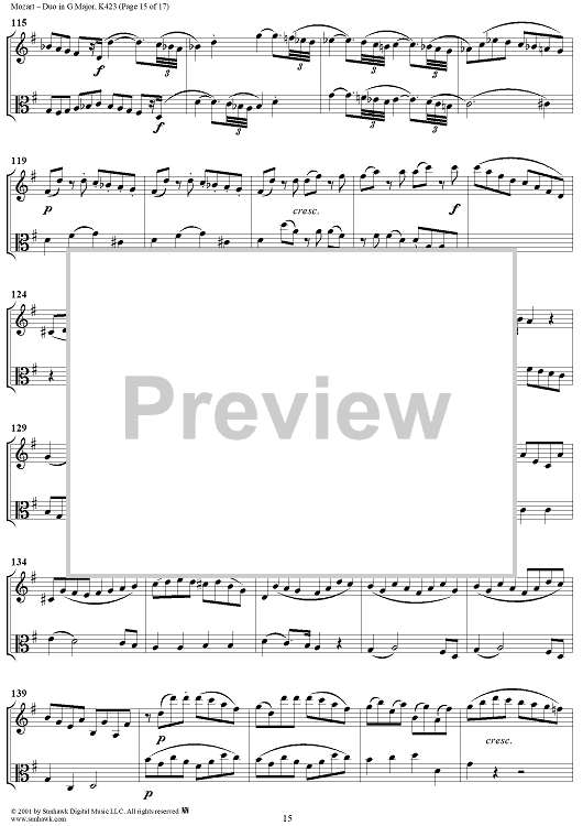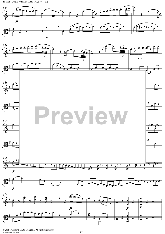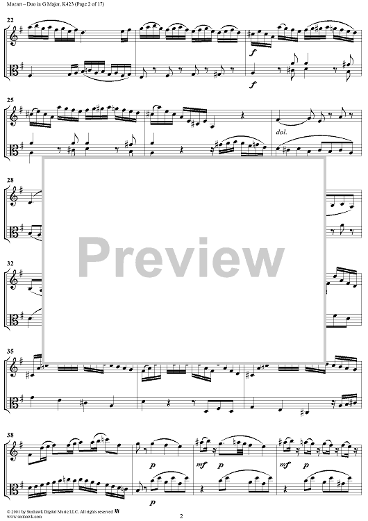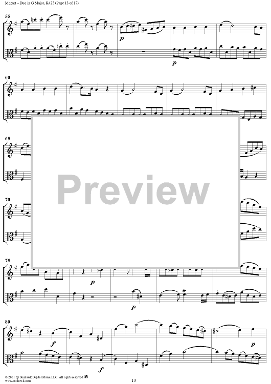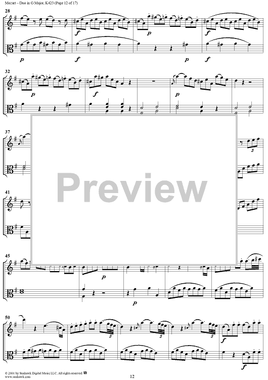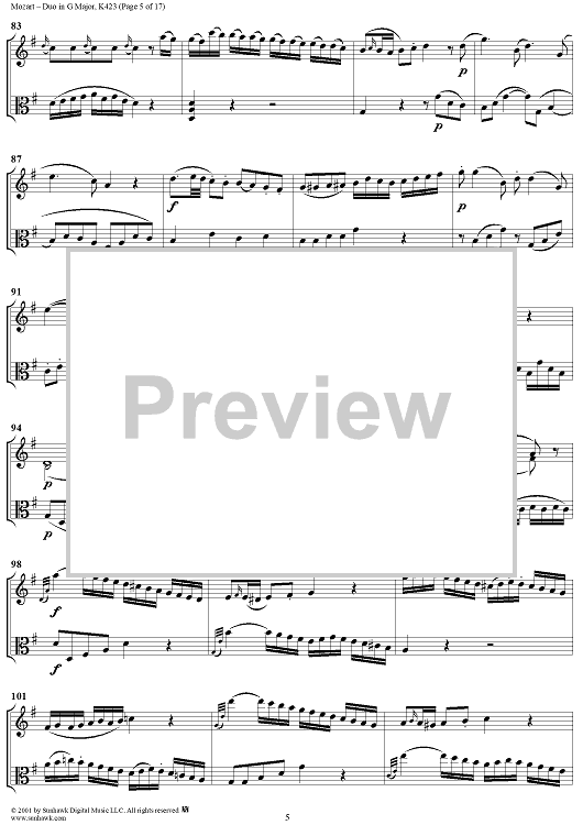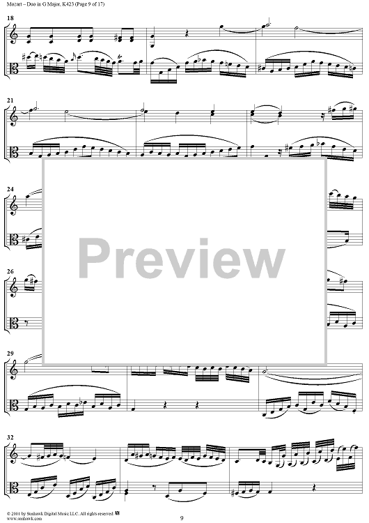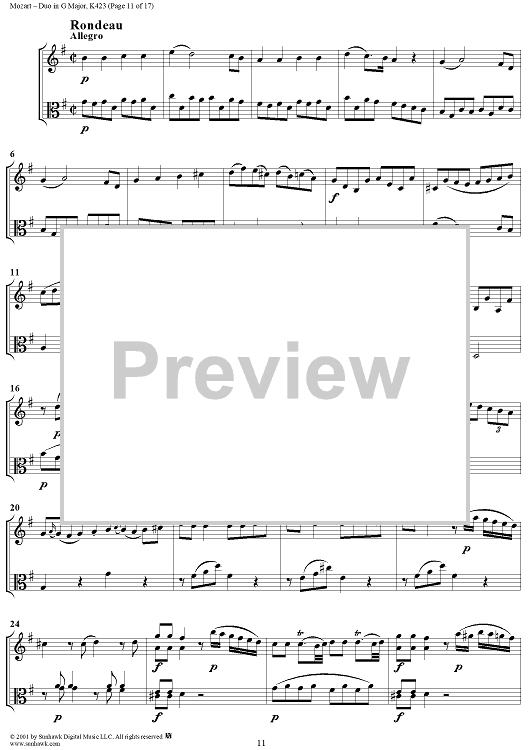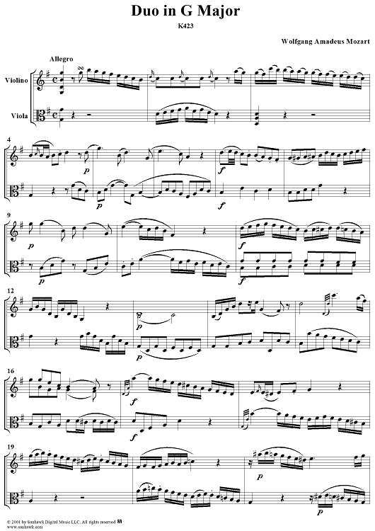 Digital Sheet Music for Duo in G Major - Score by Wolfgang Amadeus Mozart scored for Violin/Viola; id:253565